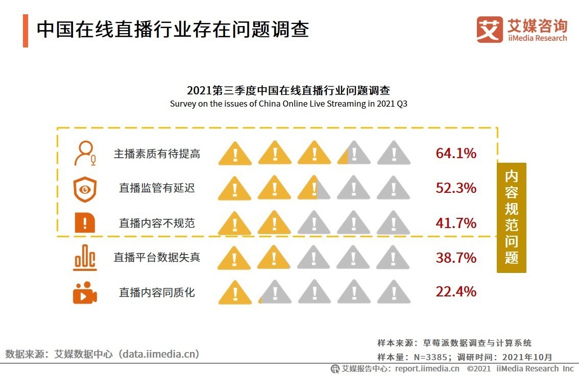 iiMedia Research(艾媒咨询)数据显示,超过六成的在线直播用户认为目前在线直播行业仍存在主播素质不高的问题,而对直播监管的延迟表示不满的用户为占比52.3%。艾媒咨询分析师认为,主播作为在线直播的核心,其个人素质很大程度上会影响到直播内容的质量,对此平台应该提高主播准入门槛,并且定时对主播进行思想品德教育,保障直播内容质量的高水准。